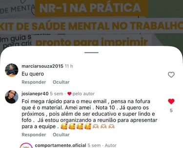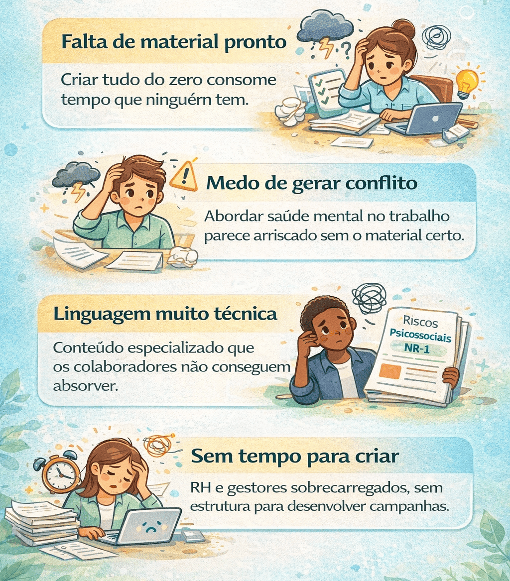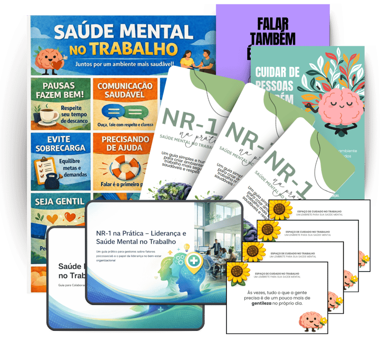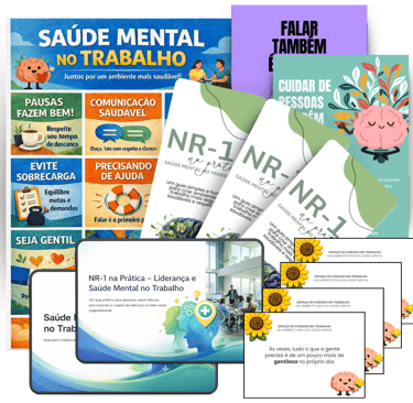 O NR-1 na Prática - Saúde Mental no Trabalho é um conjunto de materiais visuais, educativos e institucionais, criado para apoiar empresas e equipes a promoverem saúde mental no ambiente de trabalho de forma ética, leve e contínua.