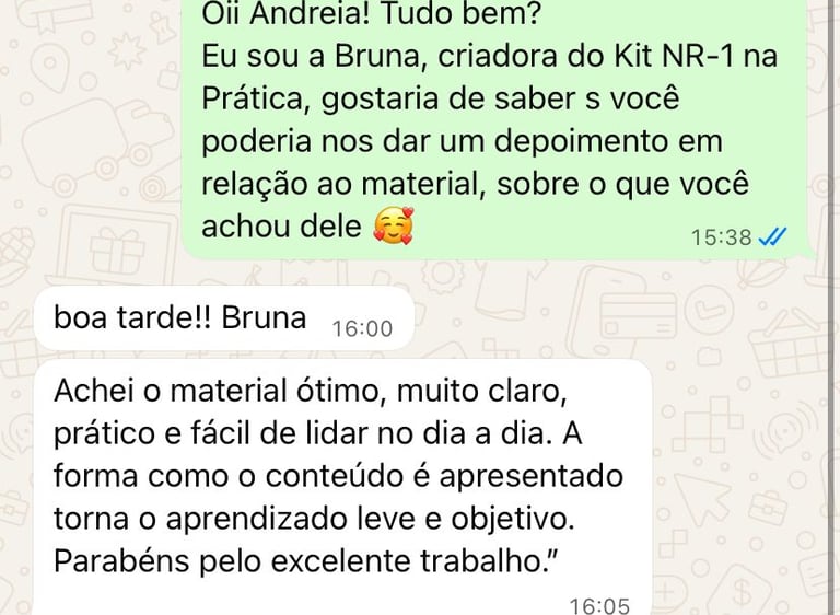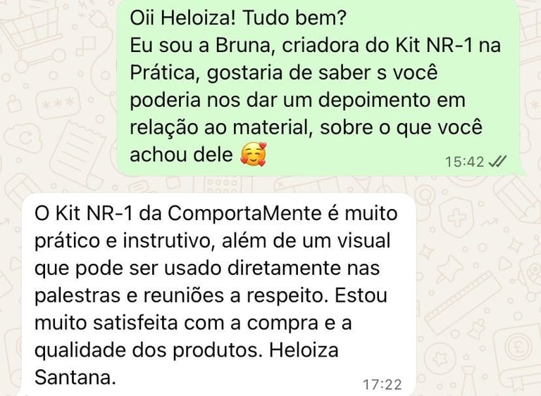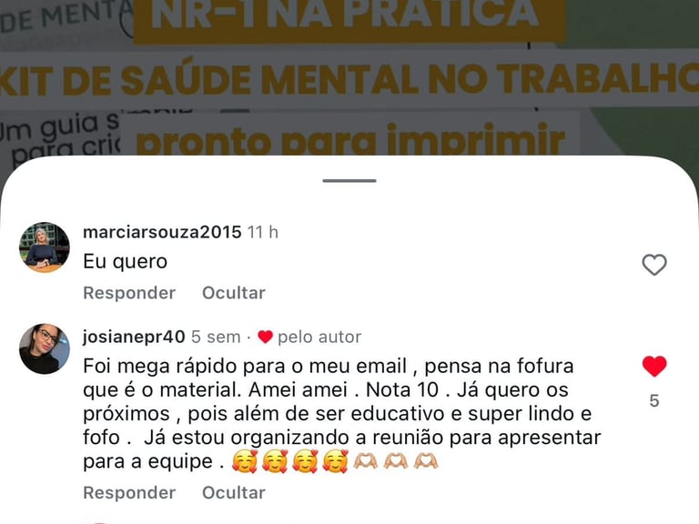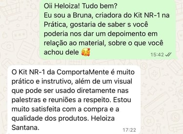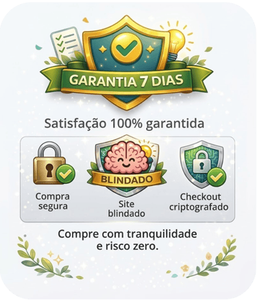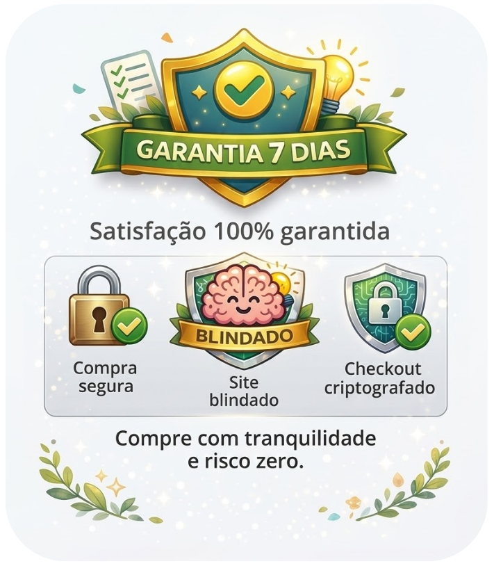 Queremos que você se sinta totalmente seguro ao adquirir o NR1 na Prática — Kit de Saúde Mental no Trabalho. Por isso, oferecemos garantia de satisfação total. Se dentro do prazo de 7 dias você entender que o kit não é adequado para a sua realidade, basta solicitar o reembolso.