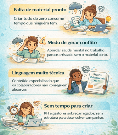 A NR-1 exige atenção aos fatores psicossociais. A maioria das empresas enfrenta os mesmos obstáculos: